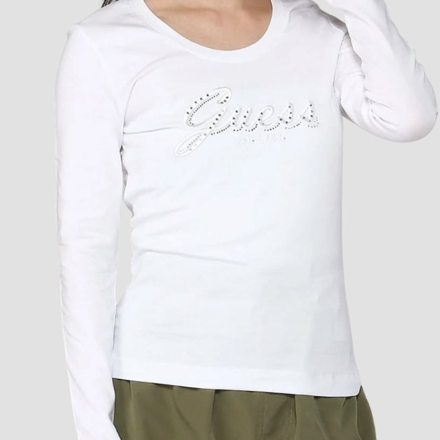 This Guess T-shirt is ideal for the fall and winter seasons. Whether you’re dressing up for a casual outing, a coffee date, or a relaxed weekend brunch, this piece will keep you cozy and stylish. Its long sleeves provide warmth, while the subtle rhinestone details offer just the right amount of sparkle for any occasion. Perfect for layering under jackets or pairing with your favorite jeans, this T-shirt seamlessly fits into any seasonal wardrobe.